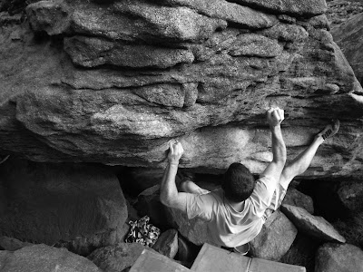 ... it's a class chunk of bouldery roof climbing and I was really enjoying the battle on it in the last few sessions. I made a slight change to my beta which eliminated a move from my sequence and made it just easier enough for me to complete it. Matched on a crimp in the roof some tension moves on a smear and a heel hook lead to a throw backwards and compression on a sloper in the lip of the roof, you don,t want to hold this sloper for long so an immeadiate bump up to a better sloped open hand grip, from here I adjust my feet about keeping the tension, drop my right knee and do another more powerful bump to a higher sloper, my right heel swings up over the lip to hand height, I flag my left leg searching for a balance point and then fight hard to match my left hand on the lip first on a sloper and then more left to a crimp, I slap to a sloper with my right hand and go again with my right hand to a flatty and fighting hard to maintain grip and core tension I grab the jug and hold a huge swing whilst pulling my knees up to my chest to avoid a dab on the rock behind, from here it's an easy top out, a truly excellent problem and satisfying send for me, my first 7A in my local bouldering area where I was first inspired by the good granite of Glendo to become a bouldering fanatic ... sweet !! There is even more good weather on the way so can you guess where I am going on the weekend ? ... yup Glendalough :) Happy climbing folks !!